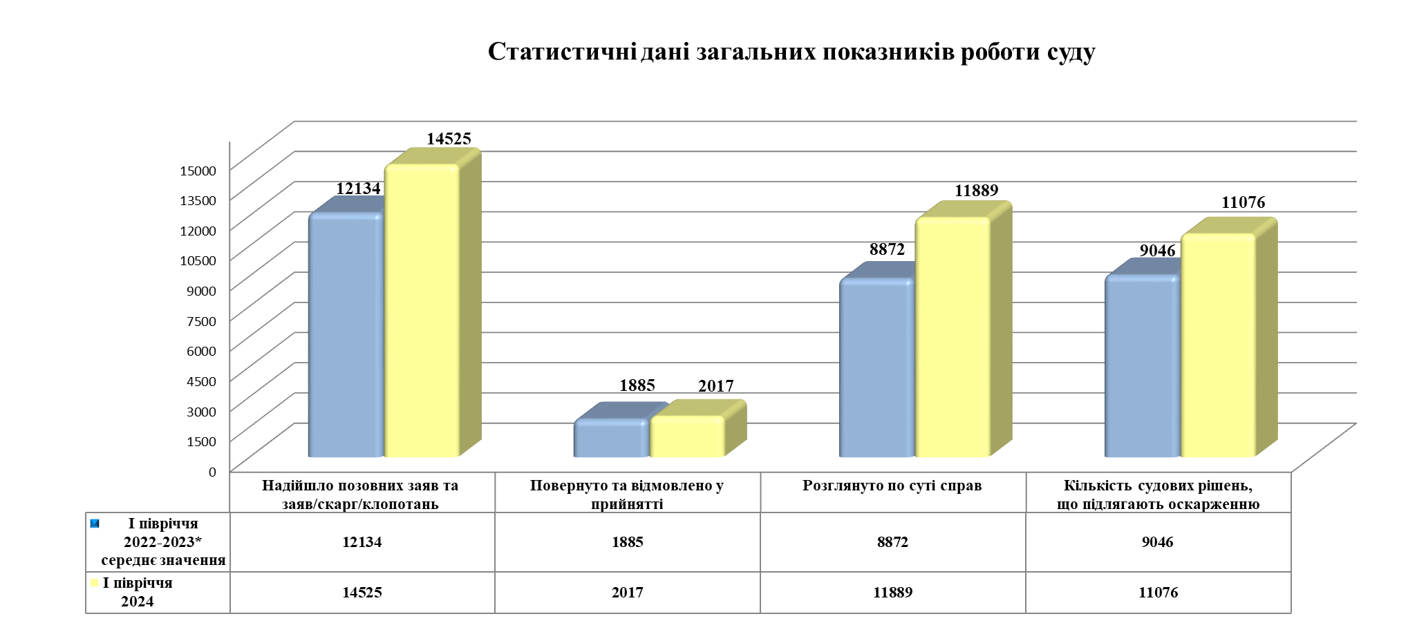 Упродовж першого півріччя 2024 року до Господарського суду міста Києва надійшло 14 525 позовних заяв та заяв/скарг /клопотань, 11 889 розглянуто по суті, 2017 повернуто та відмовлено у прийнятті.