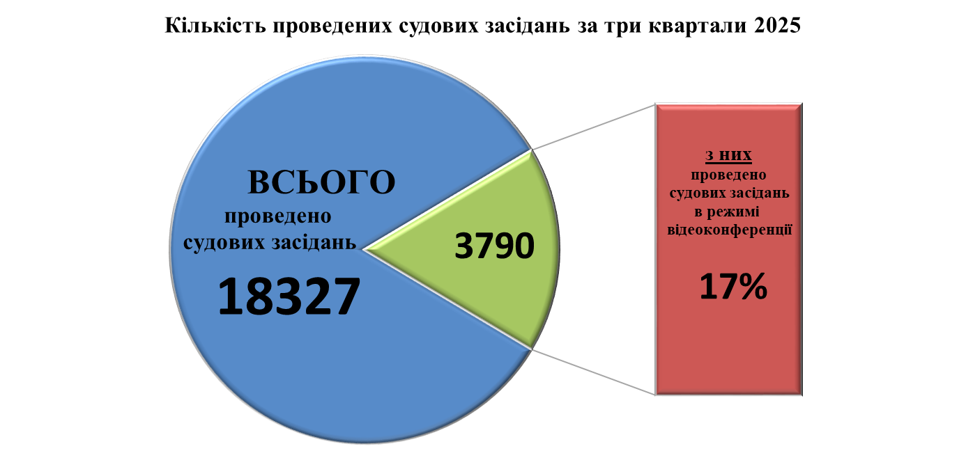За три квартали 2025 року в приміщенні Господарського суду міста Києва було проведено 18 327 судових засідань, з них 3 790 засідання (17% від загальної кількості) були проведені в режимі відеоконференції, що дозволило забезпечити участь сторін дистанційно.