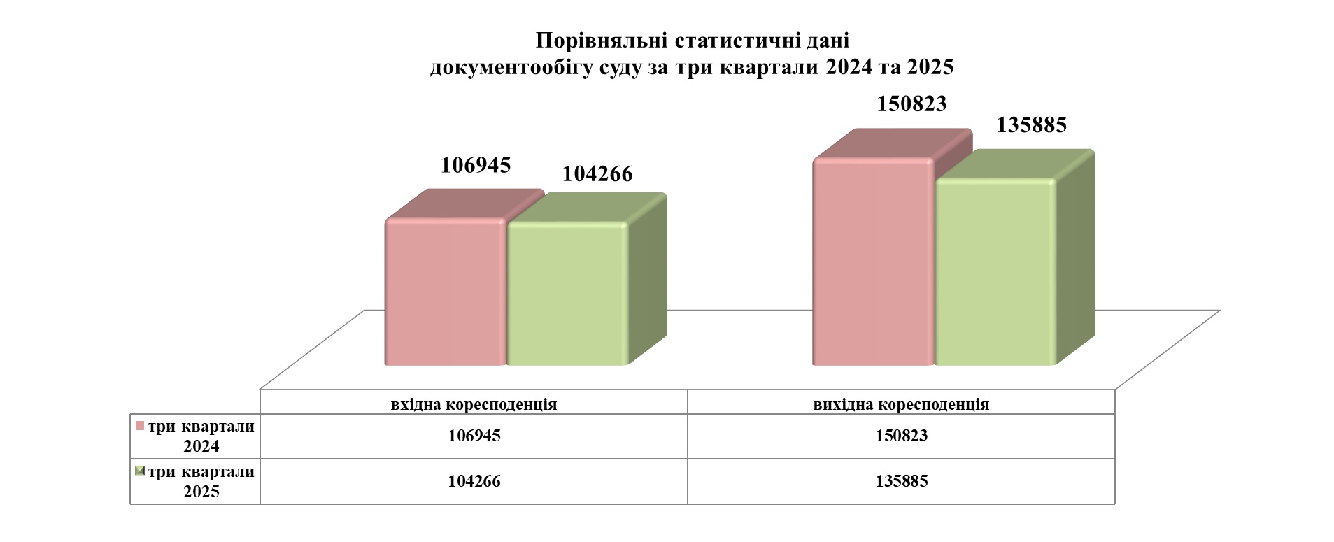 Загальний документообіг суду за звітний період становив 240 151 одиниці кореспонденції, з них 104 266 вхідної та 135 885 вихідної. Цей показник знизився порівняно з минулим роком, зменшення може бути обумовлене зміною у обсягах надходження/відправлення документації.