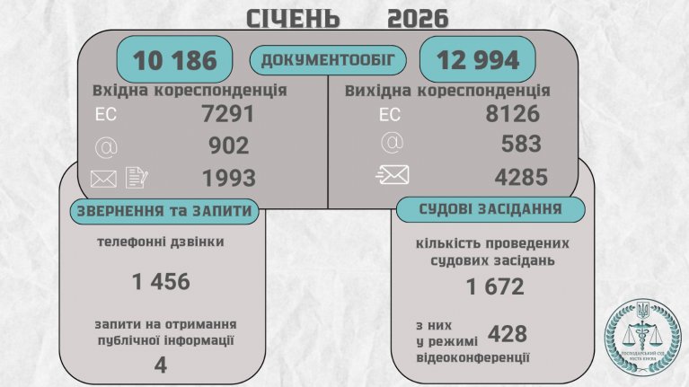 Господарський суд міста Києва у січні 2026 року отримав 10 186 одиницю вхідної кореспонденції: